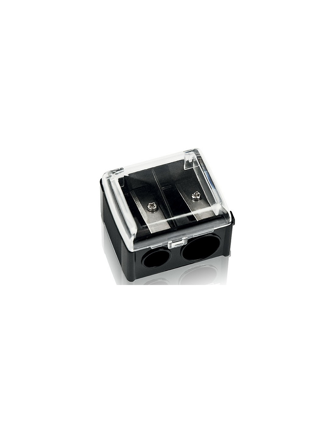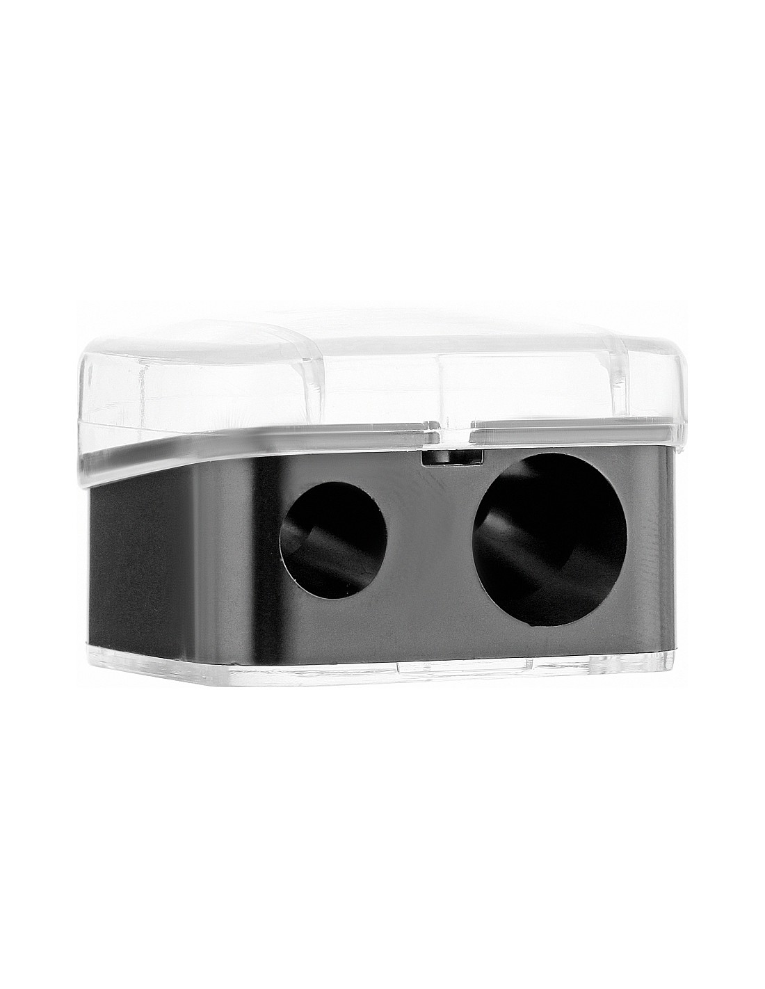 Sacapuntas doble, para lápices de tamaño standar y gruesos. La base color negro y su tapa es transparente.