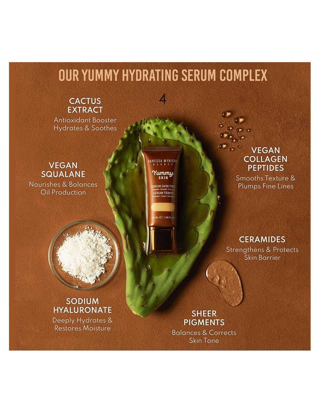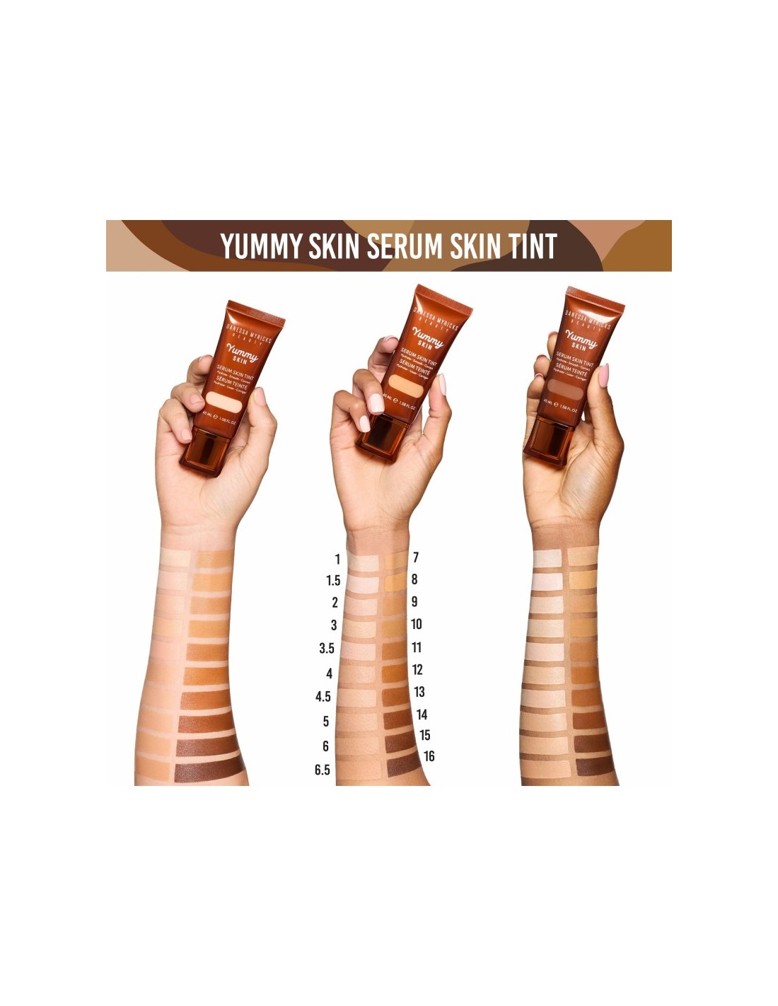 Base de Maquillaje Yummy Skin Serum de Danessa Myricks. Híbrido entre sérum y base, con textura ligera que equilibra la hidratación de la piel.