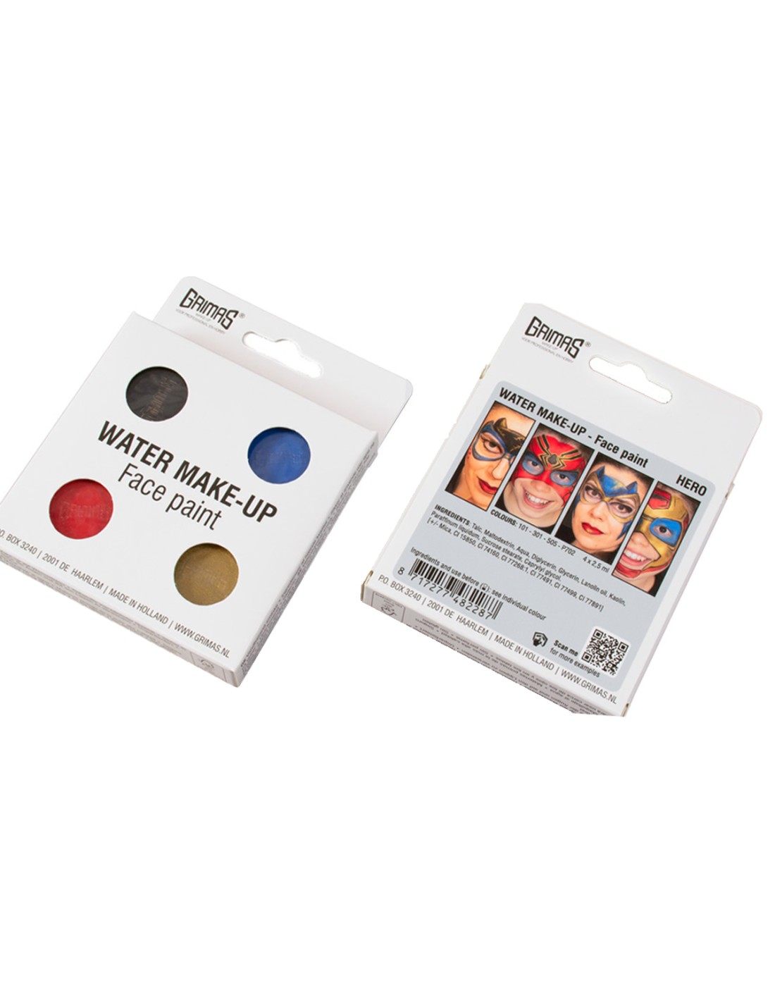 Set de pintura facial consta de 4 colores de pintura facial a base de agua (2,5 ml). En la parte posterior de la caja hay 4 ejemplos que se pueden realizar con ella. Y si escaneas el código QR, inmediatamente descubrirás aún más ideas de maquillaje geniales.