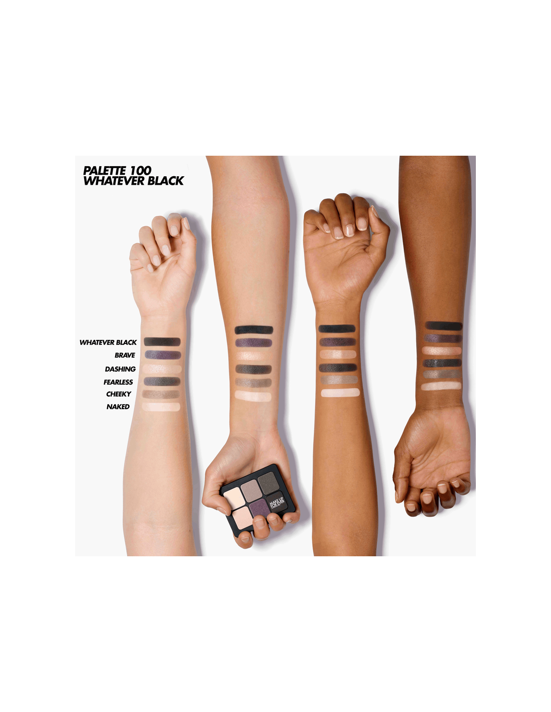 Wherever Walnut es la paleta perfecta para ojos azules, pero si buscas una paleta para maquillaje ahumado, entonces Whatever Black es para ti.
